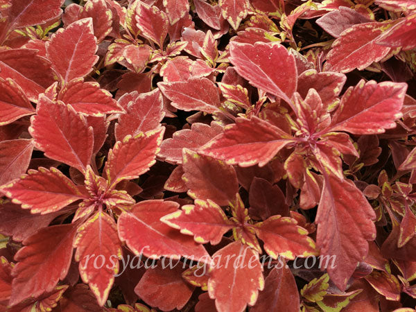 Terra Nova® 'Maharaja' is a vigorous spreader with leaves of a deep red with a gold edge. It is a multipurpose coleus that is great for hanging baskets, groundcovers and large mixed containers. Self-branching. Performs best in partial shade.
