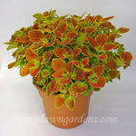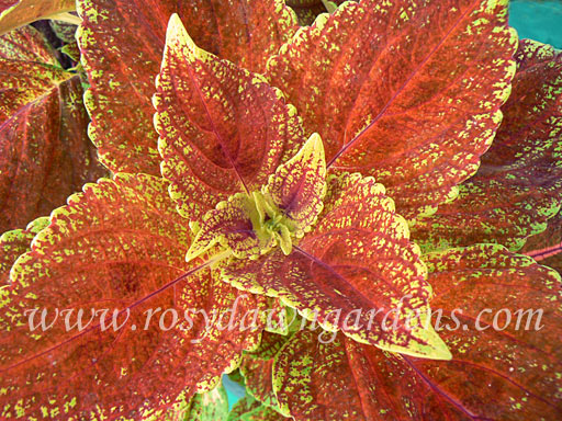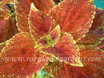 Wide, soft leaves of orange-red are surrounded at the edge with a lacy yellow pattern. Sun tolerant. A Baker's Acres original.