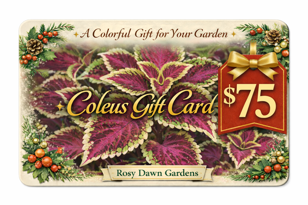 Not sure which of our beautiful coleus to choose for your lucky recipient? You have come to the right place! Rosy Dawn Gardens offers gift cards in four denominations: $25, $50, $75, and $100.