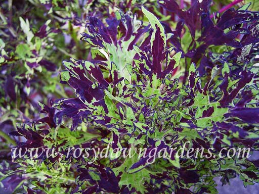 Frilly and lacy, these fantasy-type leaves of green edged with deep purple have a light, feathery, visual texture. Its softly rounded form is great for hanging baskets and urns. Very nice! Sun tolerant.