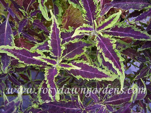 Very narrow, lance shaped leaves of deep purple with irregular chartreuse edging. Tall and linear, it is great for the back of a combination planting as it combines well with other coleus. Adds contrast and texture when mixed with wider-leaved subjects. Interesting and beautiful! Sun tolerant.