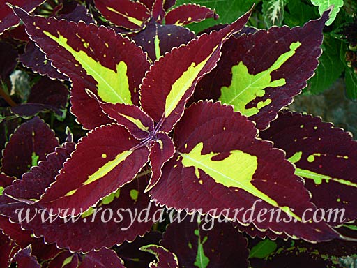 Deep maroon leaves have a "planet" of gold in the center surrounded by smaller stars. Classic coleus form and fairly sun tolerant.