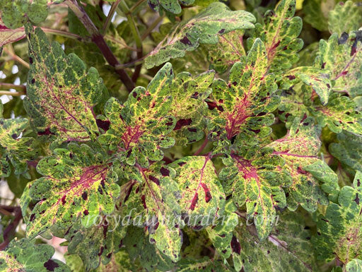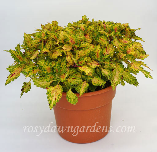 Sunny yellow leaves are generously speckled with crimson. The scalloped edges are dappled with soft green. This stunning coleus should be protected from harsh sunlight. A Vern Ogren introduction.