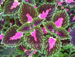 Deep purple trailing coleus with a lacy green border and a shock of hot pink in the center of the textured leaf. This is by far the most vigorous and sun tolerant trailing coleus of which we know, and it can trail up to 36". Heirloom variety that has been popular since the Victorian era. Sun tolerant.