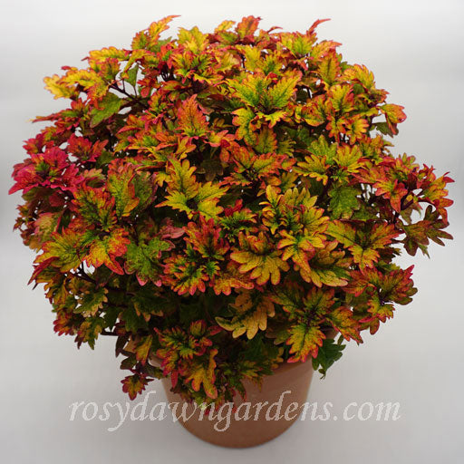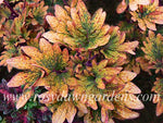 The small, toothy leaves of this coleus have a warm and pleasing combination of orange, green, and purple. Plant habit is compact and well-behaved. Loves long, warm days and a bright location for best color.