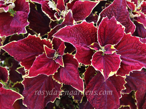 Wide, deeply red leaves with a bright golden edge that is loopy and unique. Sun tolerant. From Stained Glassworks.