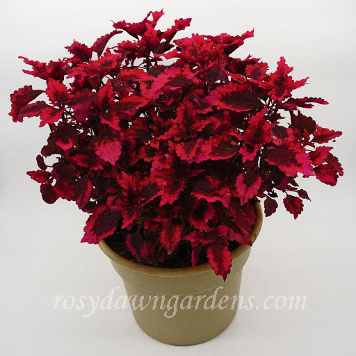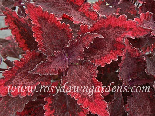 Dark mahogany coleus has textured leaves and a bright edge that is enhanced by growing in good light. Gorgeous and eye-catching! 'Hot Sauce' is formerly known as 'Tobasco', and has been a customer favorite for years. Also known as 'Mississippi Summer.' Sun tolerant.