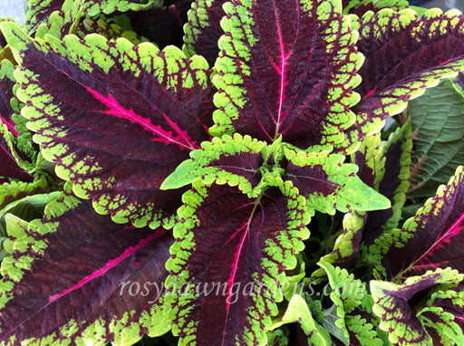 Main Street™ 'Alligator Alley' has leaves that are deep mahogany with a stripe of hot pink down the center. The wide edge is a bold, bright green. Like others in this series, it is bushy and compact and a great coleus for pots and edging a border. Very sturdy and a good grower. Sun tolerant.