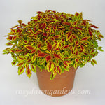 Narrow, jagged leaves of lemon-yellow are splashed with a blaze of bright red down the center of each leaf. Sun tolerant.