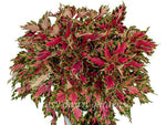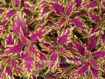 Down Town™ 'Vegas Neon' Coleus has jagged, soft-rose leaves bordered with a wide edge of green, purple, and flecks of gold. Bright light will deepen the center color to a magenta-rose. The Down Town™ collection of coleus gives small spaces a bold look. With small, fine-textured, serrated leaf shapes and multi-toned foliage, they are late to flower. All have the mounding, compact habit, and sun-tolerance that is the hallmark of the Down Town series.
