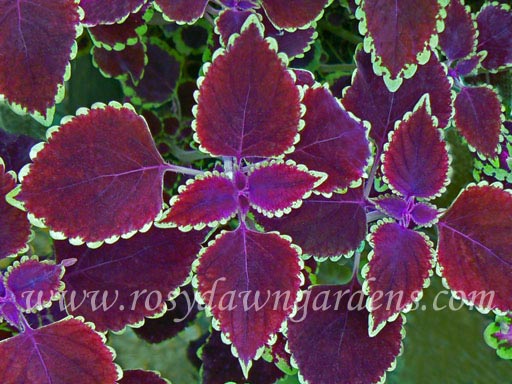 Heirloom coleus variety with velvety, deep purple leaves and a fine-toothed green edge. Mixes well with all other coleus in combination plantings. Fabulous basket plant and trails up to 30". Sun tolerant.